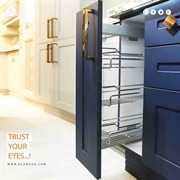 دربها با رنگ آبی نیمهمات سفارشی پوشش داده شدهاند؛ رنگی که علاوه بر زیبایی، مقاومت بالایی در برابر نور و حرارت دارد و حتی پس از سالها استفاده، جلوهی اولیه خود را حفظ میکند. ساختار منبتکاریشدهی دربها، بافتی کلاسیک و ظریف به فضا داده و هویت کابینت نئوکلاسیک ممبران را کامل کرده است. در این پروژه، از یراقآلات برند بلوم و هافله استفاده شده تا باز و بسته شدن دربها و کشوها کاملاً نرم، بیصدا و طولعمر بالا باشد. این ویژگی، در کنار استفاده از لولاها و ریلهای آرامبند، کیفیت کاربری را در سطحی ممتاز قرار داده است. دستگیرههای طلایی مات در تضاد ملایم با رنگ آبی، ترکیبی از ظرافت کلاسیک و طراحی مدرن را به وجود آوردهاند. قرنیزها و تاجهای همرنگ با بدنه نیز در هماهنگی کامل با قاببندی دربها اجرا شدهاند و در مجموع، نتیجهی کار فضایی منسجم، زیبا و بادوام است.