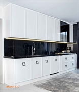 - اگر از رنگ سفید برای کابینت خود انتخاب میکنید، برای آنکه در آشپزخانهتان جلوهی بیشتری داشته باشد، میتوانید از سنگهای مصنوعی کورین یا کوارتز استفاده کنید.
