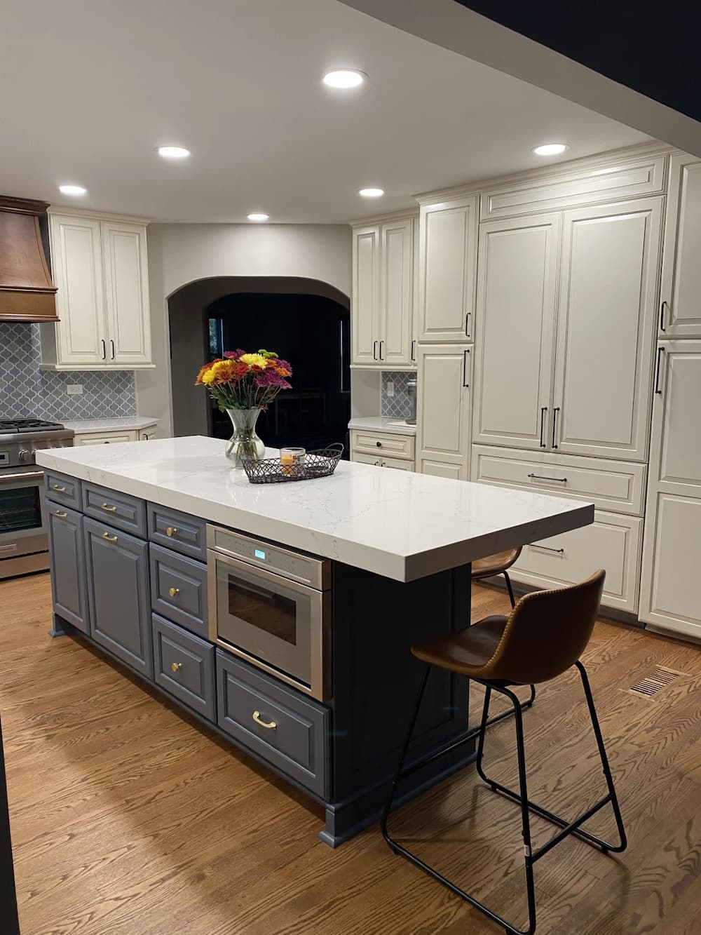 این پروژه از دیدگاه طراحی، تعادلی استادانه میان گذشته و حال است؛ جایی که منبتکاری کلاسیک با متریالهای امروزی هماهنگ شده و رنگهای خنثی و آرام مانند سفید عاجی، خاکستری روشن و بژ طلایی جلوهای گرم و باشکوه ایجاد کردهاند. انعکاس نور روی سطح مارمونایت و بدنهی رنگشده با پلیاورتان، باعث میشود فضا روشنتر و گستردهتر به نظر برسد و حس لوکس بودن در تمام زوایا حفظ شود.